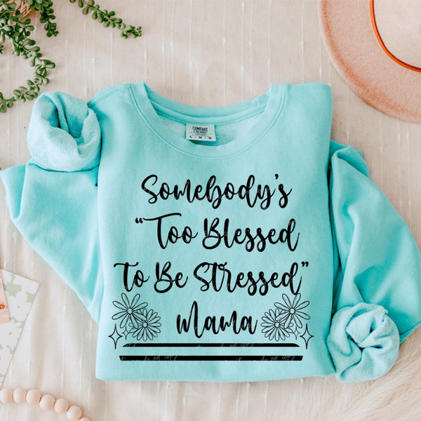Somebody’s “too blessed to be stressed” mama BLACK (VIRGO) 90832 DTF transfer