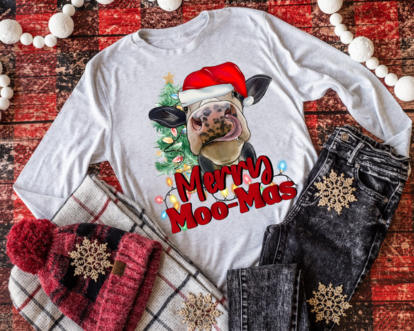 Merry Moo-Mas Cow With Santa Hat Christmas Tree (Red Font) 8723 DTF TRANSFER