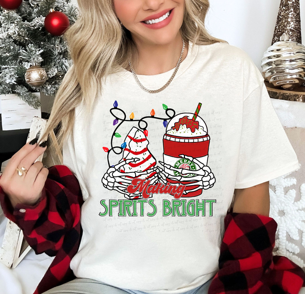 Making Spirits Bright Red and Green Font Christmas Tree Cake Latte Skellie Hands 115003 DTF Transfer