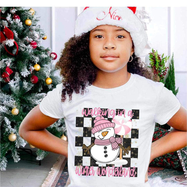 Walking in a winter wonderland (pink font and snowman with checkered background) 16621 DTF Transfer