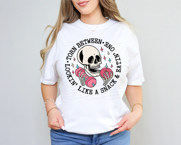 Torn Between Lookin' Like A Snack and Eatin' One Skellie with Dumbbell and Donut 116365 DTF Transfer