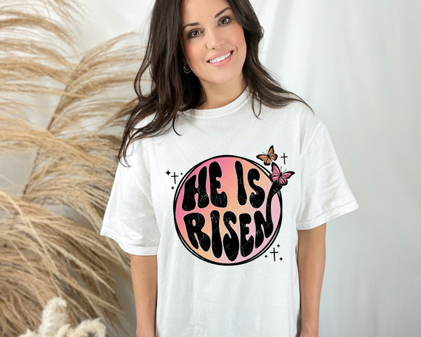 He Is Risen (circle ombre background, pastel colors, butterflies) DTF Transfer