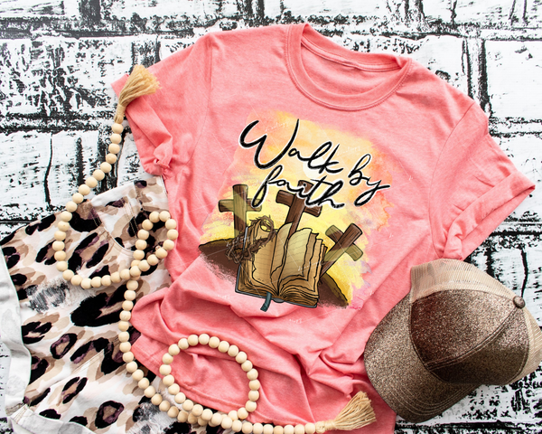 Walk By Faith (three wooden crosses, open book, crown of thorns, black handwriting) 8893 DTF Transfer