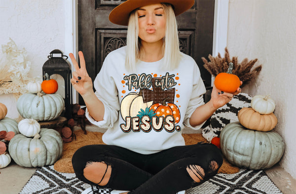 Fall into jesus cross with cream colored pumpkin and orange polka dot pumpkin 2194 DTF TRANSFER