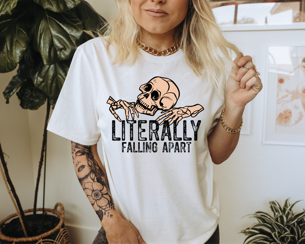 Literally Falling Apart (skeleton with distressed black block lettering) 1388 DTF TRANSFER
