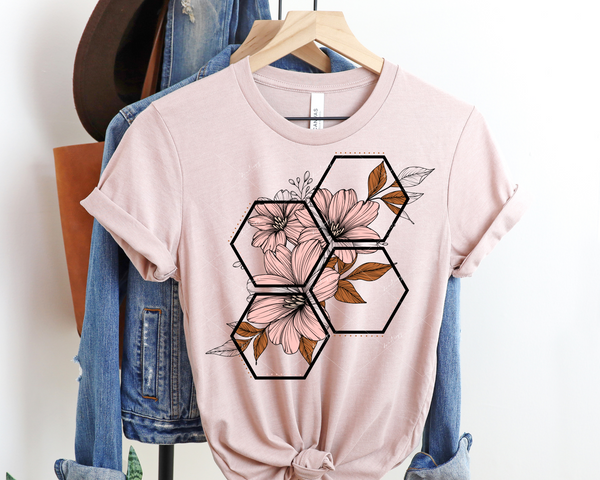 4 octagons black outline with vintage flowers, dusty peach color DTF TRANSFER