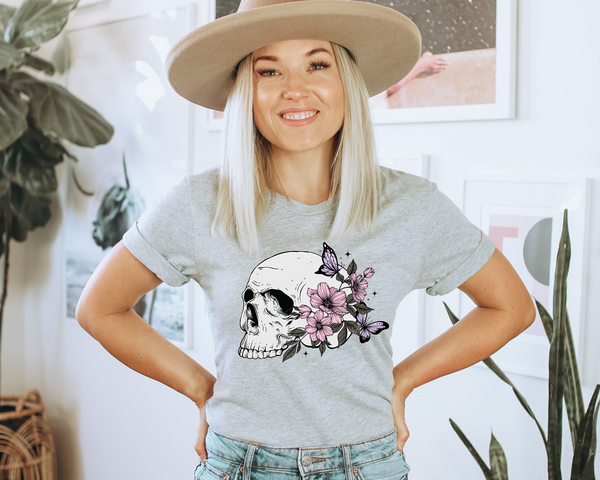 Skull with pink floral and purple butterflies 1404 DTF TRANSFER