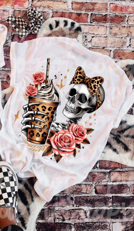 Skellie with leopard bow and coffee (VS) 52232 DTF transfer