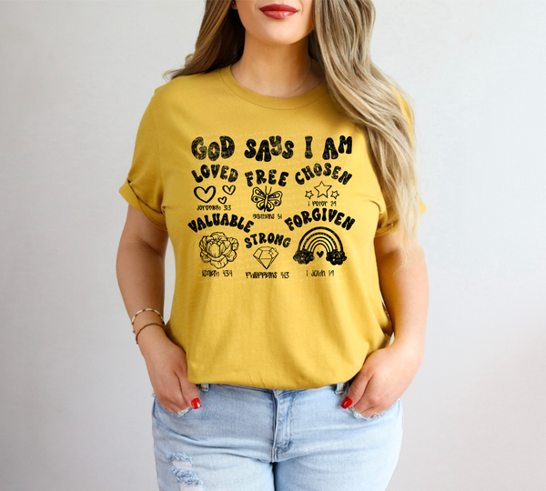 God Says I Am Loved Free Chosen Valuable Strong Forgiven Black Grunge 86328 DTF Transfer