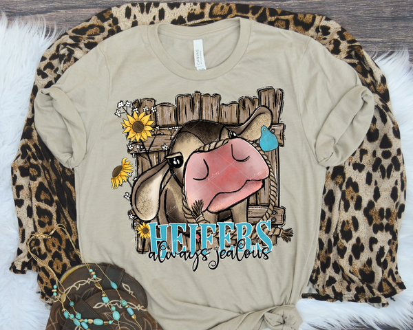 Heifers always jealous (heifer face, old wooden fence, sunflowers, blue lettering) 1847 DTF TRANSFER