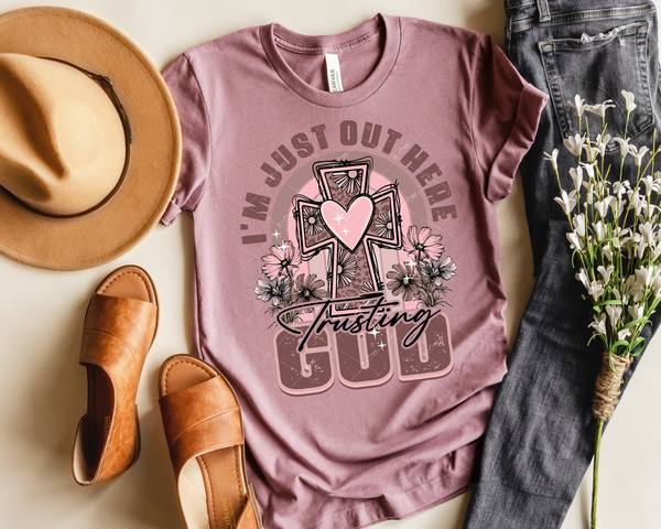 I'm Just Out Here Trusting God (mauves and pinks, cross, flowers, heart, distressed) 1580 DTF TRANSFER