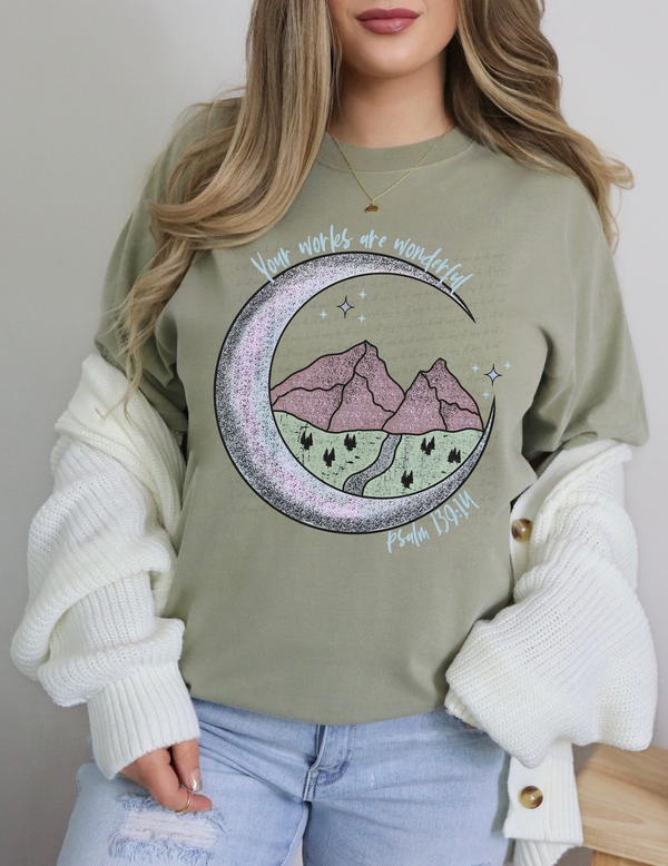 Your Works Are Wonderful Psalm 139.14 Crescent Moon and Mountains 115084 DTF Transfer
