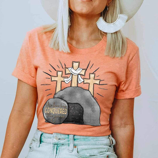 His love has conquered the grave rocks and crosses 19880 DTF TRANSFER