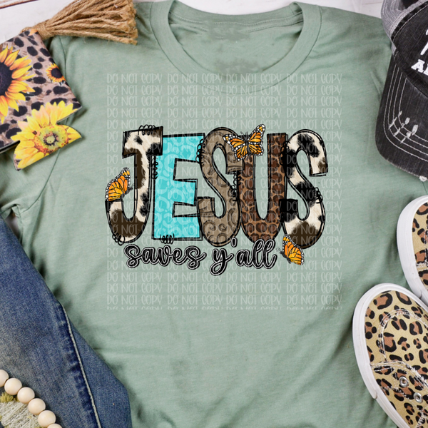 Jesus saves y'all cowhide turquoise leopard font butterflies DTF TRANSFER