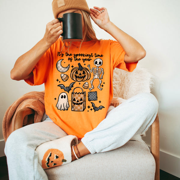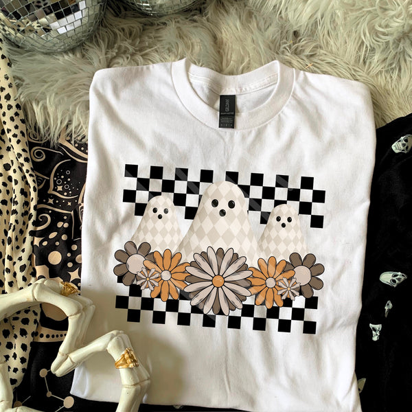 3 Ghosts with flowers and orange wavy checker Ghost 110706 DTF transfer