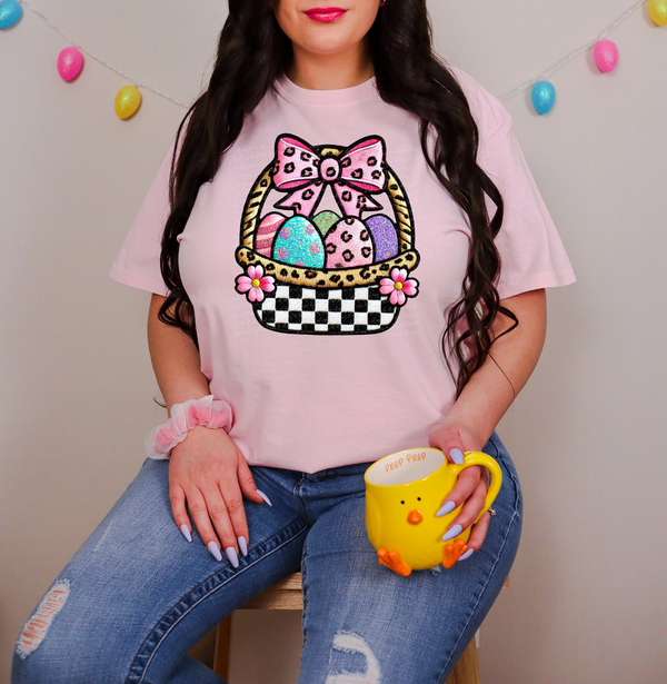 Checkered Easter Basket Of Egg With Bow Faux Embroidery DTF Transfer