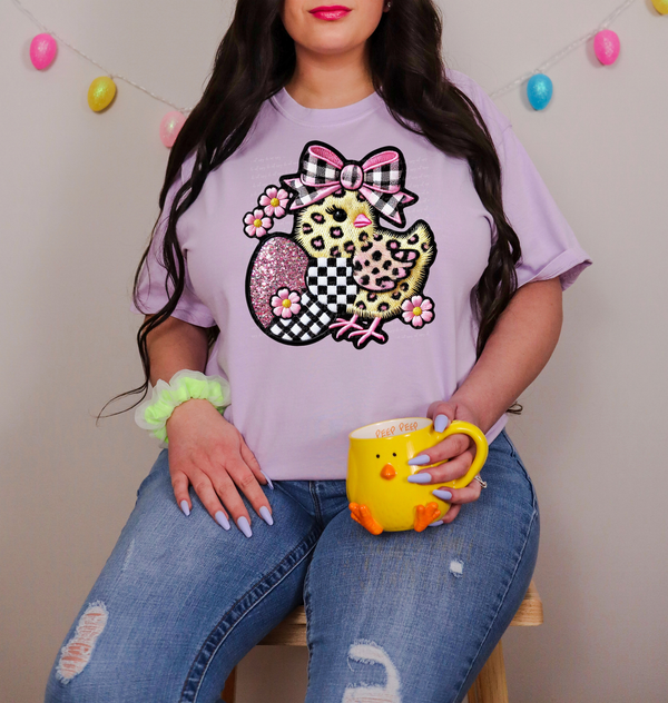 Checkered Easter Chick With Bow Faux Embroidery 81980 DTF Transfer