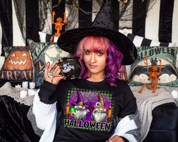 Halloween (gnomes, candles, webs, deep purple, black & green gingham background) 1459 DTF TRANSFER