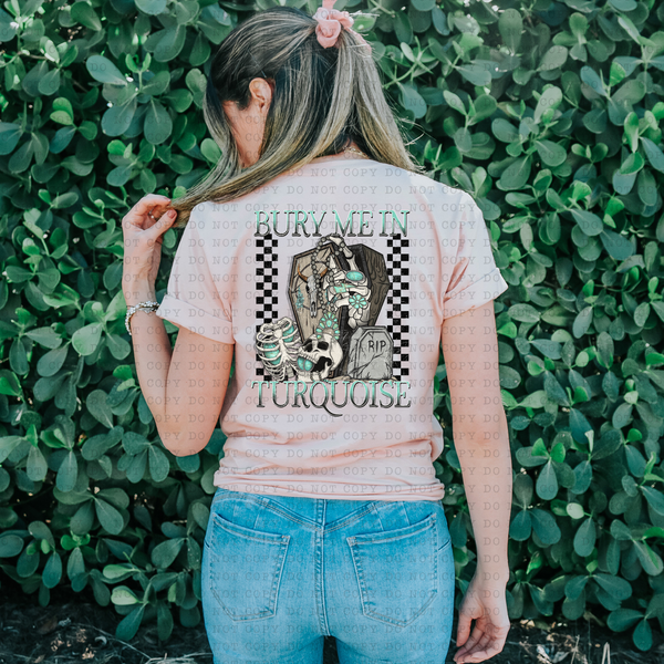 Bury Me In Turquoise BACK ONLY (checkered, coffin, skeleton, turquoise jewelry) 3443 DTF TRANSFER