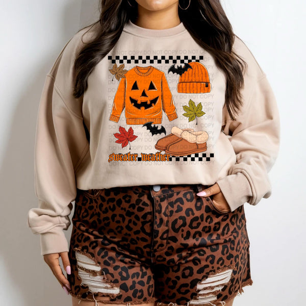 Sweater Weather with pumpkin sweater and boots SCG DTF transfer