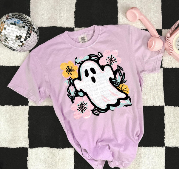 Ghost with black outline and abstract flowers SCG DTF transfer