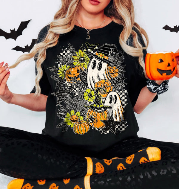 Ghost with orange and green florals and checker (ag) DTF transfer