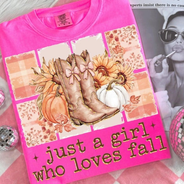 Just a Girl who Loves Fall with boots and sunflower pumpkins DTF transfer