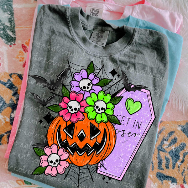 Get In Loser coffin and skull flowers (MMD) DTF transfer