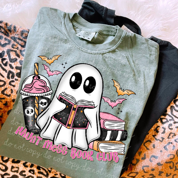 Haunt mess book club ghost latte pink font mmd DTF transfer