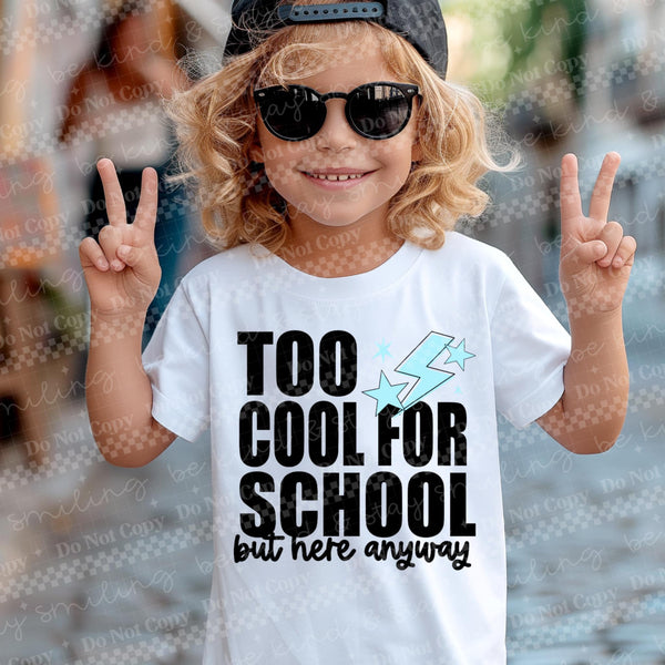 Too Cool For School but here anyway blue lightning bolt DTF transfer