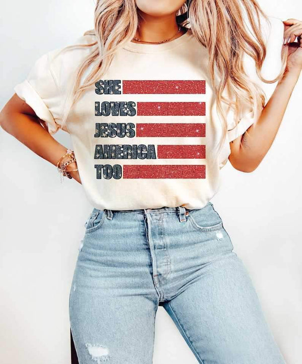 She loves jesus america too blue words red stripes 26867 DTF transfer