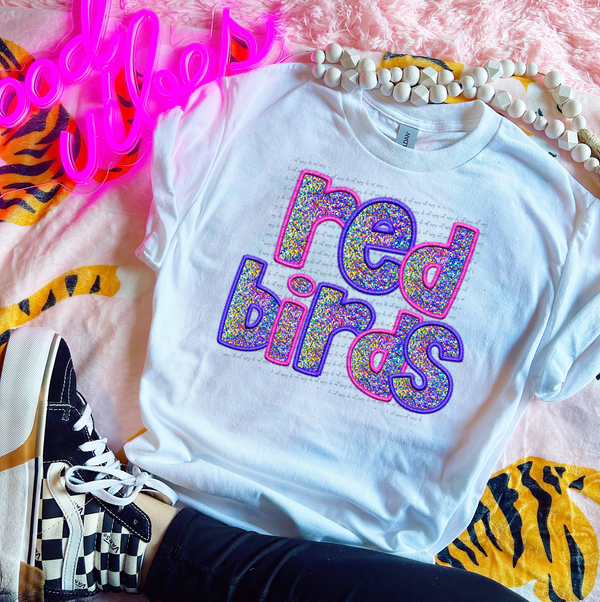 Red Birds Faux Embroidery Pink Blue 76086 DTF Transfer