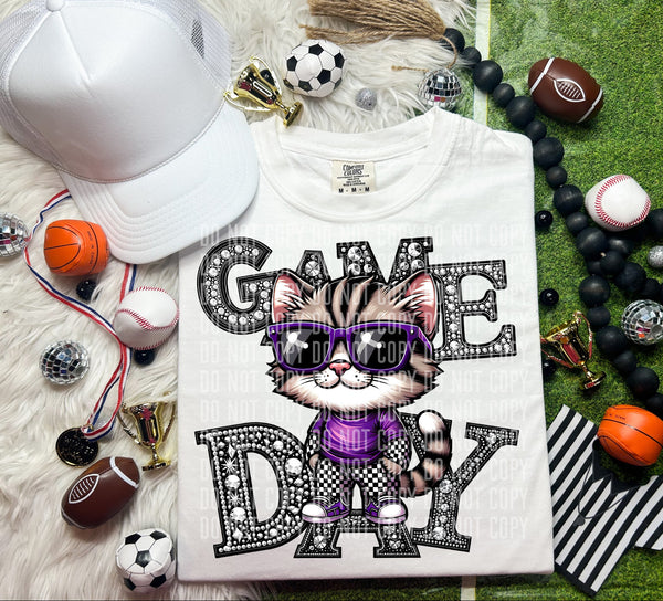 Game Day Silver Rhinestones Checkered Cat 54632 DTF transfer
