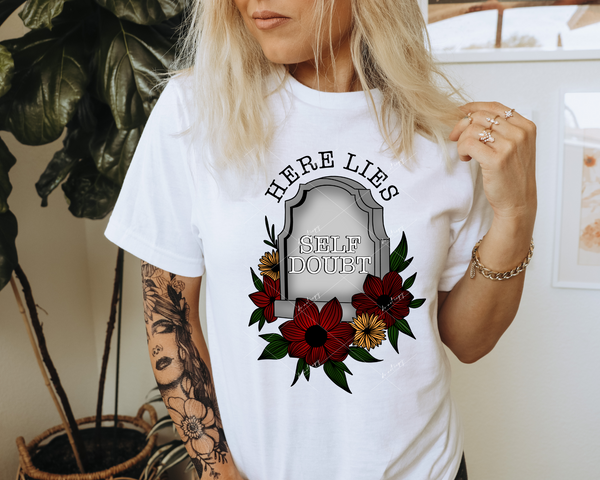 Here Lies Self Doubt (headstone, dark orange & yellow flowers) 8870 DTF Transfer