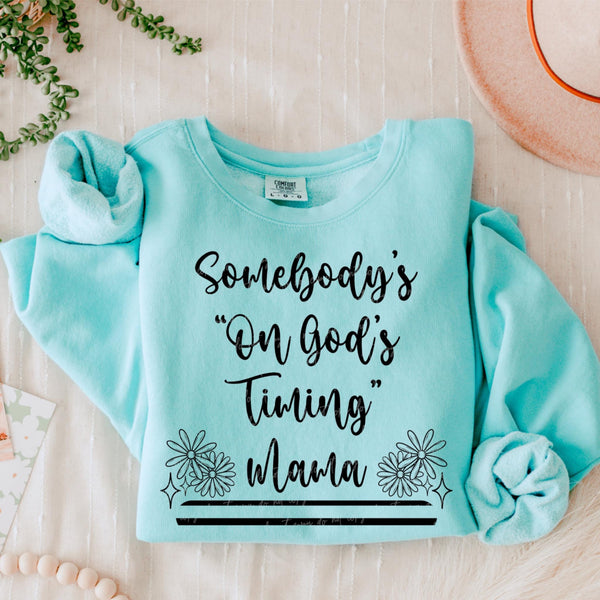 Somebody’s “on gods timing” mama BLACK (VIRGO) 90803 DTF transfer