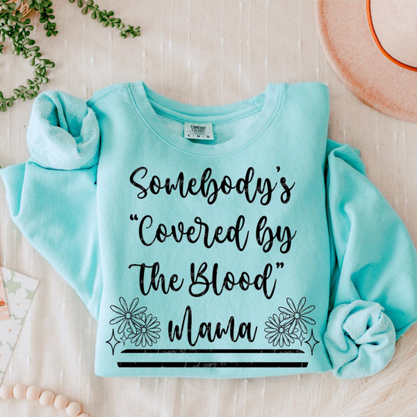 Somebody’s “covered by the blood” mama BLACK (VIRGO) 90734 DTF transfer