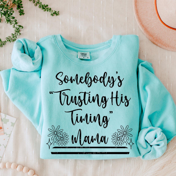 Somebody’s “trusting his timing” mama BLACK (VIRGO) 90804 DTF transfer