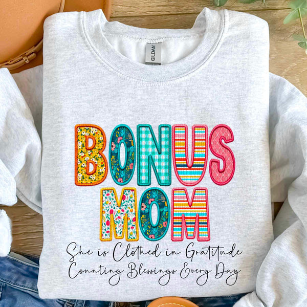 Bonus mom she is clothed patterned faux embroidery (SDD) 19743 DTF Transfer