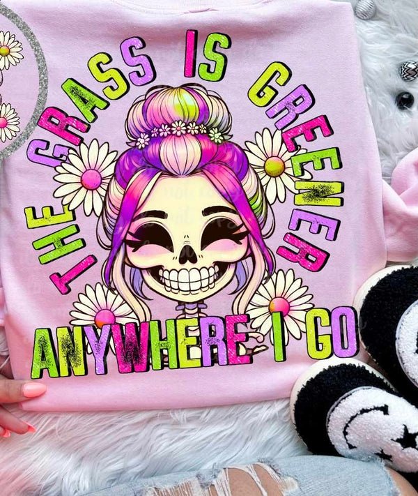 The grass is greener anywhere I go skellie girl with daisies 32319 DTF transfer