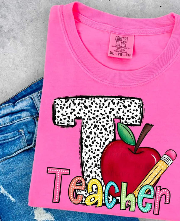 Teacher dalmatian T with apple and pencil (ABD) DTF transfers