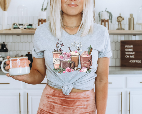 Coffee Please Coffee First (mauve colors, coffee cups, florals, butterflies) 8836 DTF Transfer