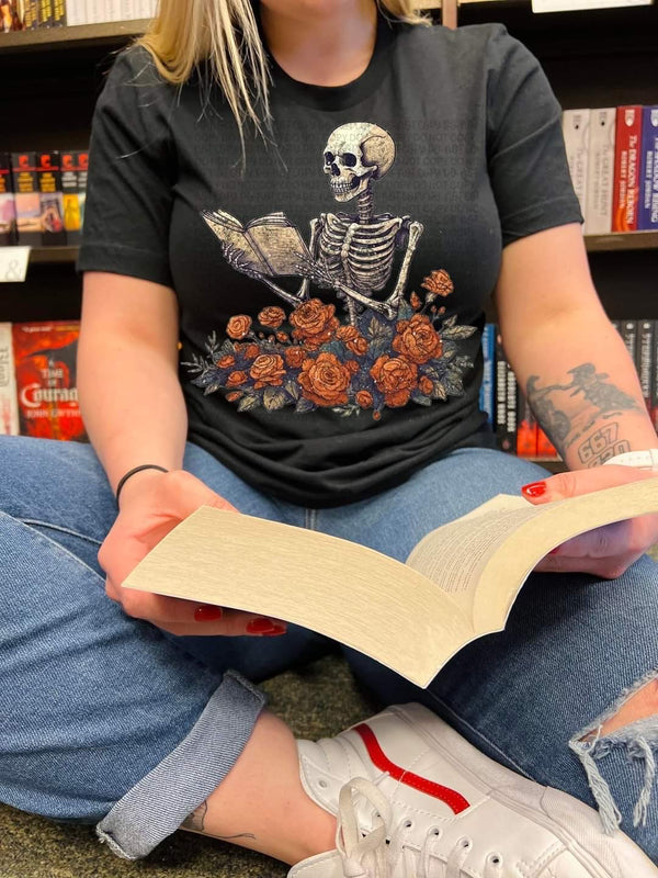 Skeleton reading book in flowers DTF TRANSFER
