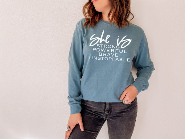 She is strong powerful brave unstoppable WHITE screen print transfer