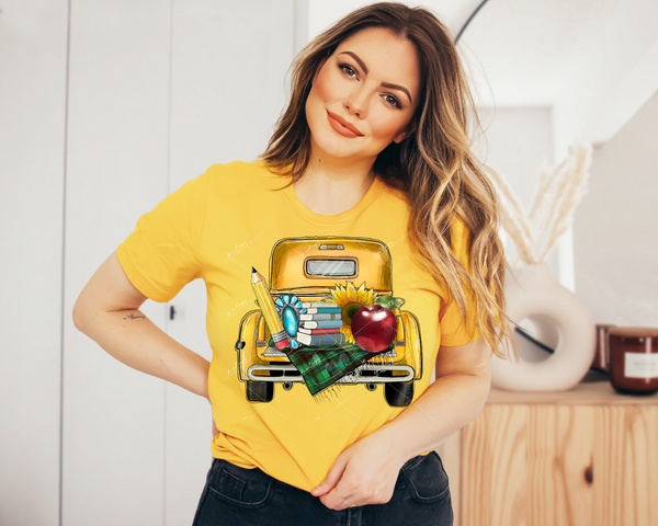 Vintage truck bed filled with school elements, sunflower, turquoise pendant 1890 DTF TRANSFER