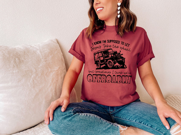 I know I'm supposed to let Jesus take the wheel offroadin screen print transfer