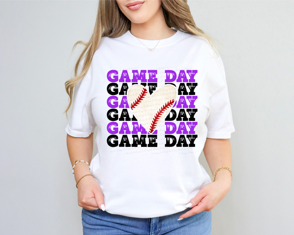 Game Day Stacked Black and Purple Baseball Heart 116419 DTF Transfer
