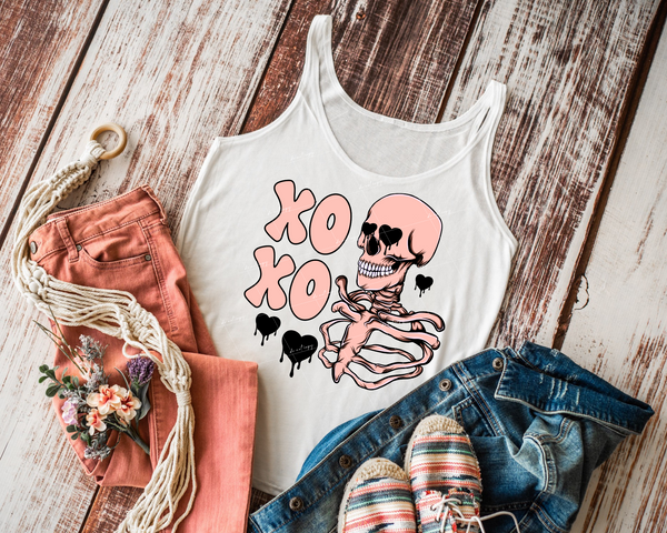 XOXO (pink skeleton bust with black heart eyes, black hearts dripping) 1916 DTF TRANSFER