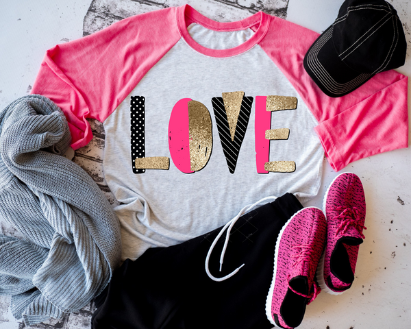 Love Love Love (light pink, dark pink, gold glitter stripe lettering) 1736 DTF TRANSFER