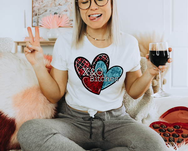 X & O Bitches (three hearts, blue, red and plaid textures) 1914 DTF TRANSFER