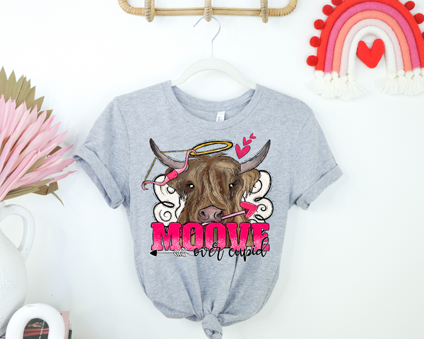 Move over cupid (long-hair heifer, arrows and bow, pink hearts, pink and black lettering) DTF TRANSFER